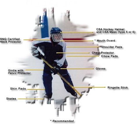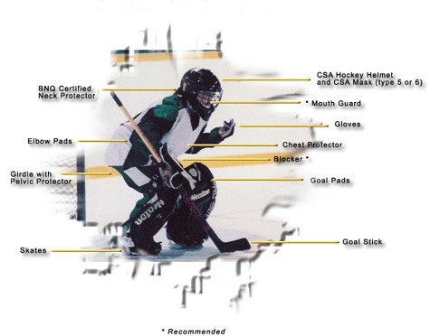 Goalie Equipment (at most Divisions): Is provided for by the Association (pads, blocker, catcher, gel glove, body armour, goalie stick)